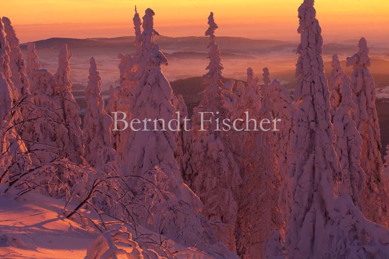 verschneiter Bergwald Abendrot - Zum Vergroessern klicken!